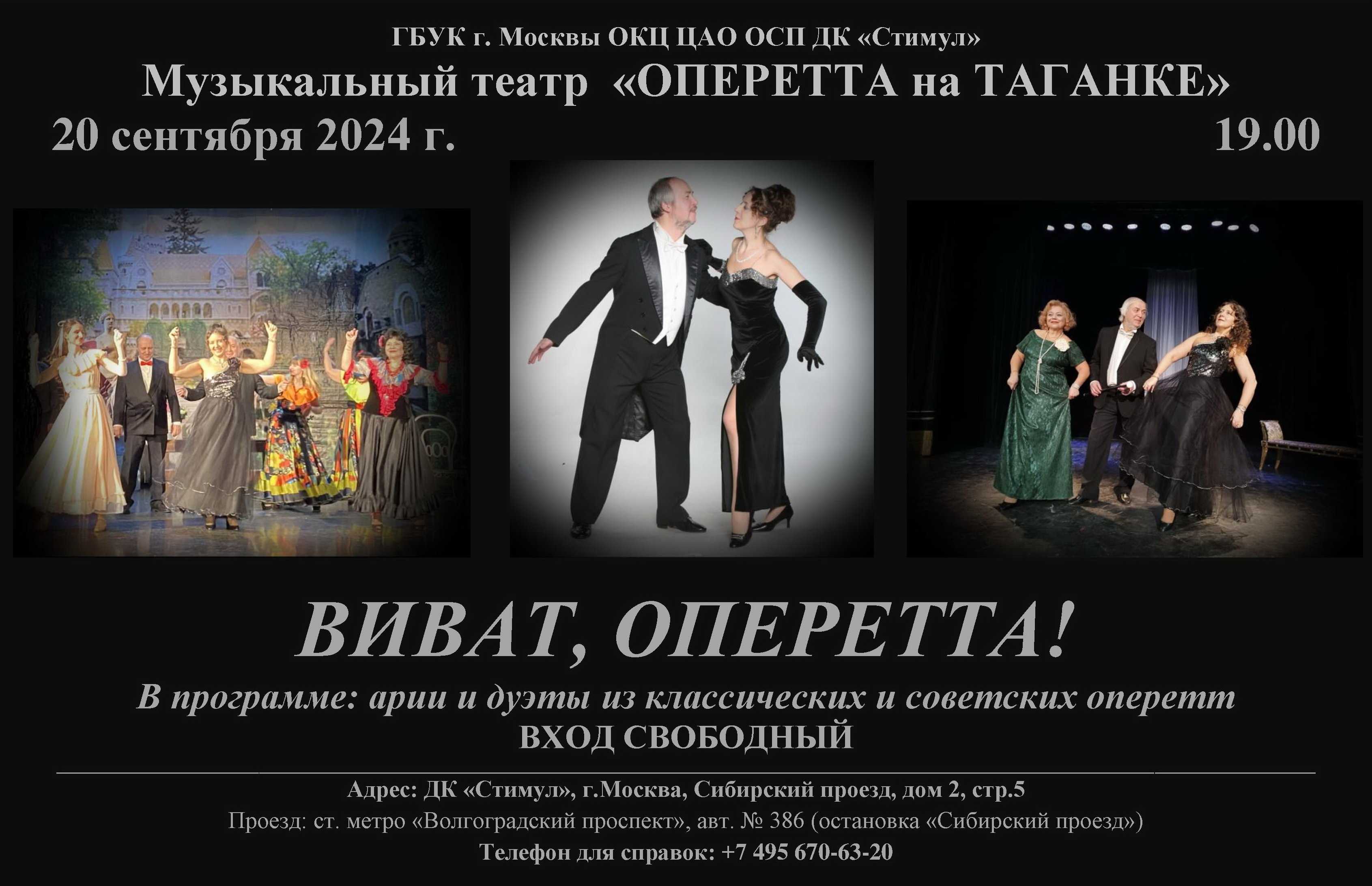 20 сентября 2024 г. в 19.00 в театральном зале ДК «Стимул» будет представлен вечер оперетты «Виват, Оперетта!» в исполнении артистов Музыкального театра «Оперетта на Таганке» (ГБУК г.Москвы «ОКЦ ЦАО» ОСП «ДК «Стимул»)