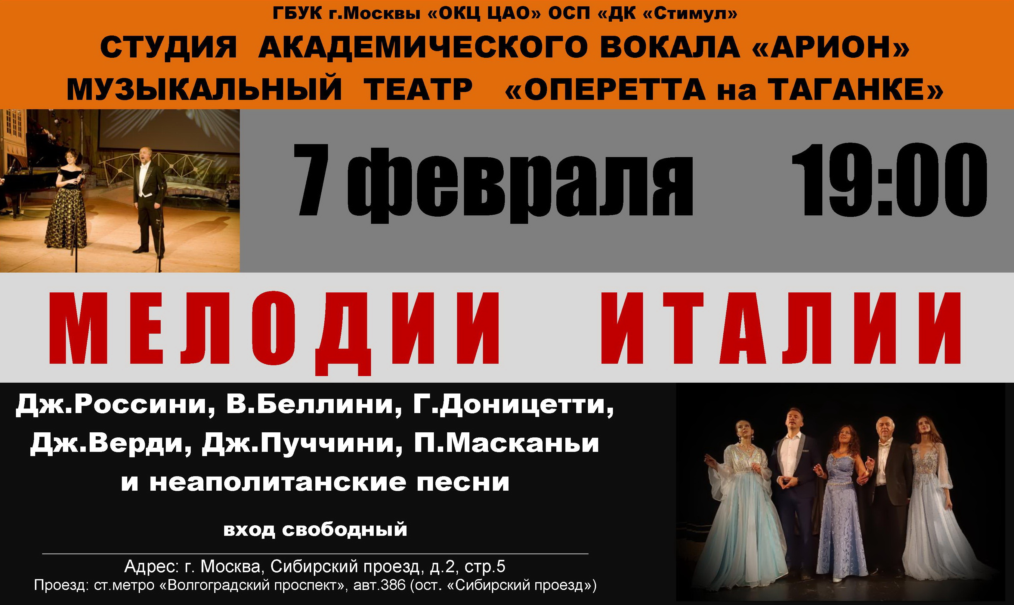7 февраля в 19.00 Музыкальный театр "Оперетта на Таганке" и студия академического вокала "Арион" приглашают на концерт "Мелодии Италии".