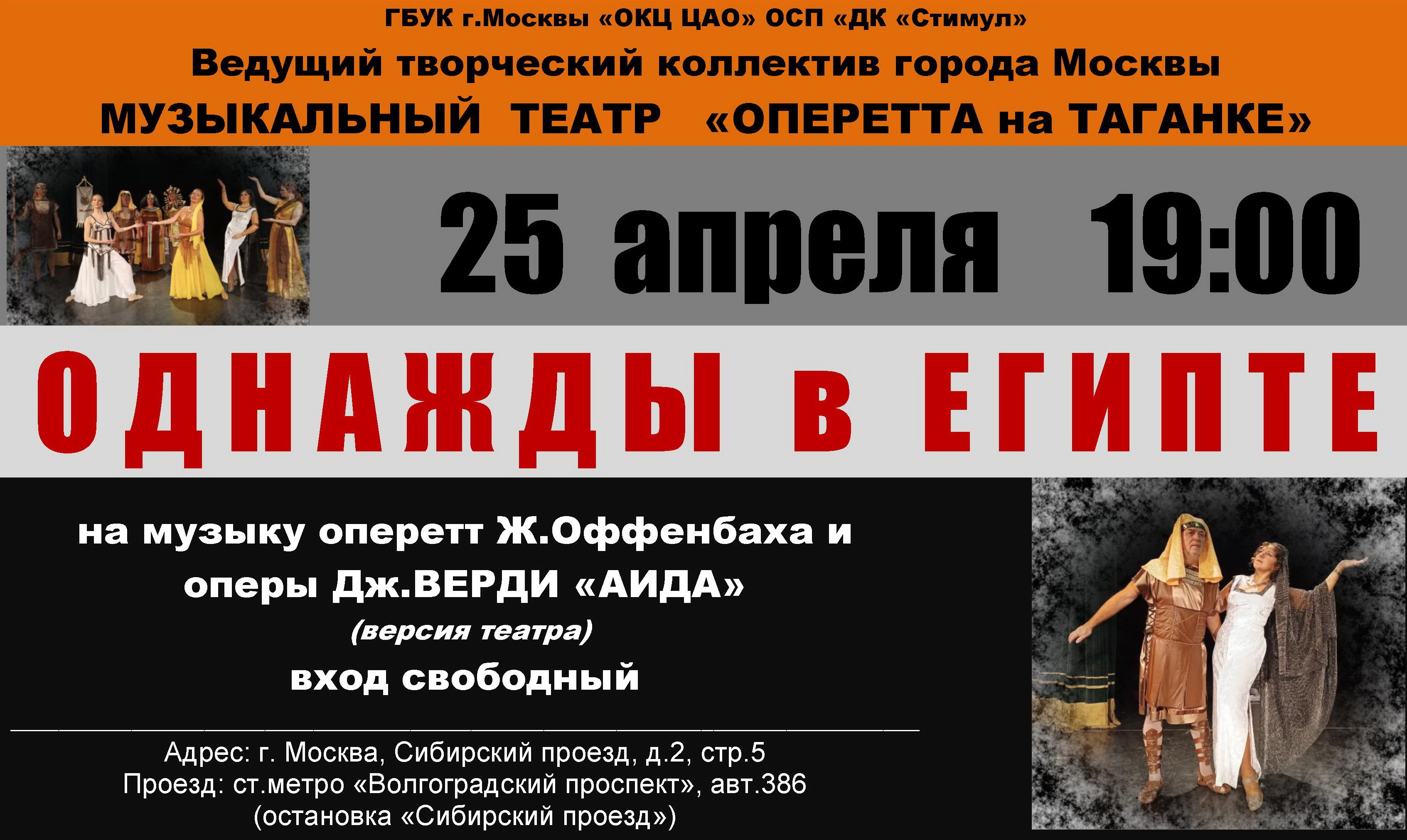 25 апреля Музыкальный театр "Оперетта на Таганке" представляет музыкально-драматический спектакль "Однажды в Египте" на музыку оперы "Аида" Джузеппе Верди и оперетт Жака Оффенбаха.