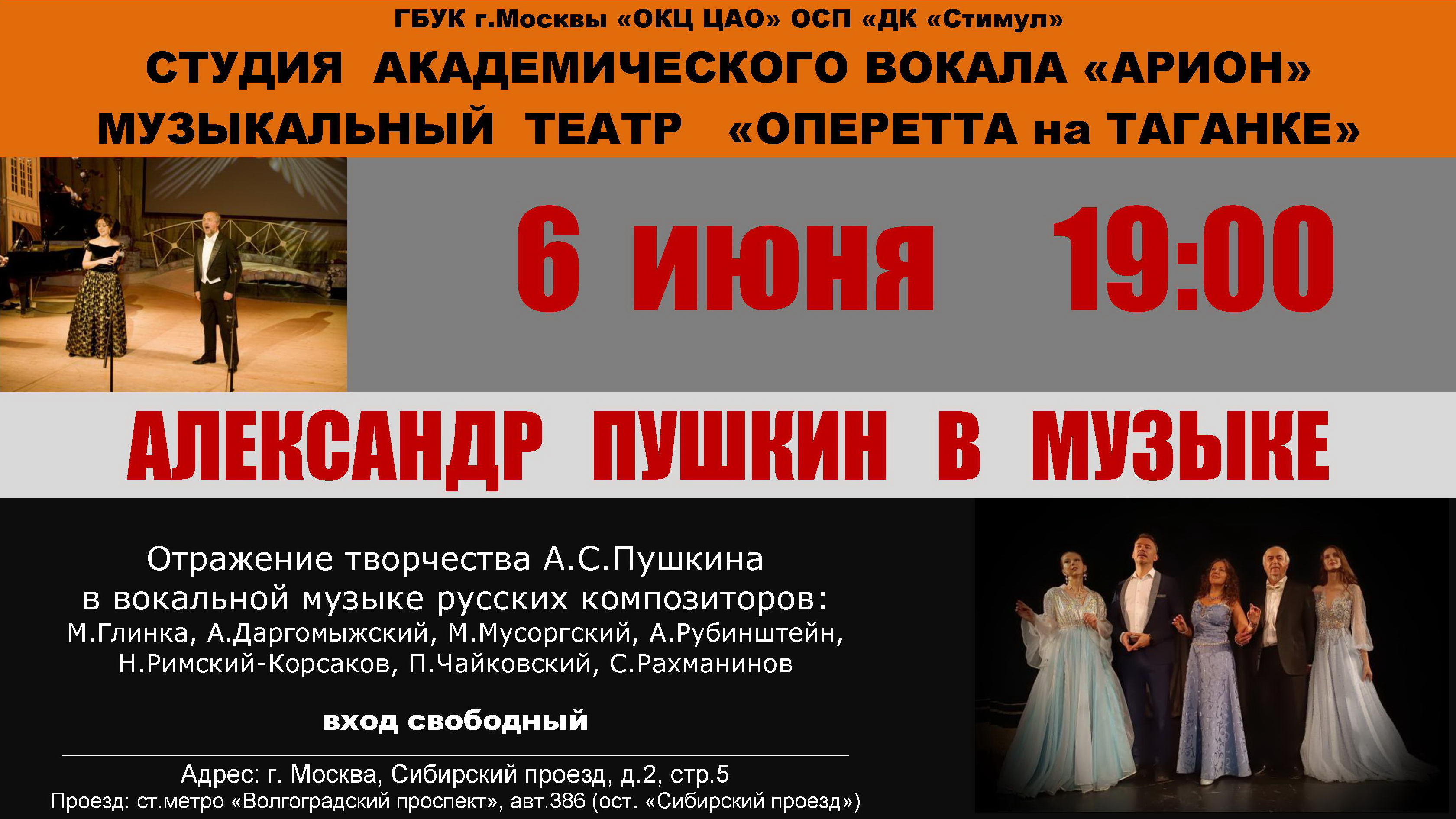 Музыкальный театр "Оперетта на Таганке" и Студия академического вокала "Арион" представляют 6 июня в 19.00 музыкально-просветительскую программу "Александр Пушкин в музыке": отражение творчества Александра Сергеевича Пушкина в вокальной музыке русских композиторов (Михаил Глинка, Модест Мусоргский, Антон Рубинштейн, Николай Римский-Корсаков, Петр Чайковский, Сергей Рахманинов и другие).