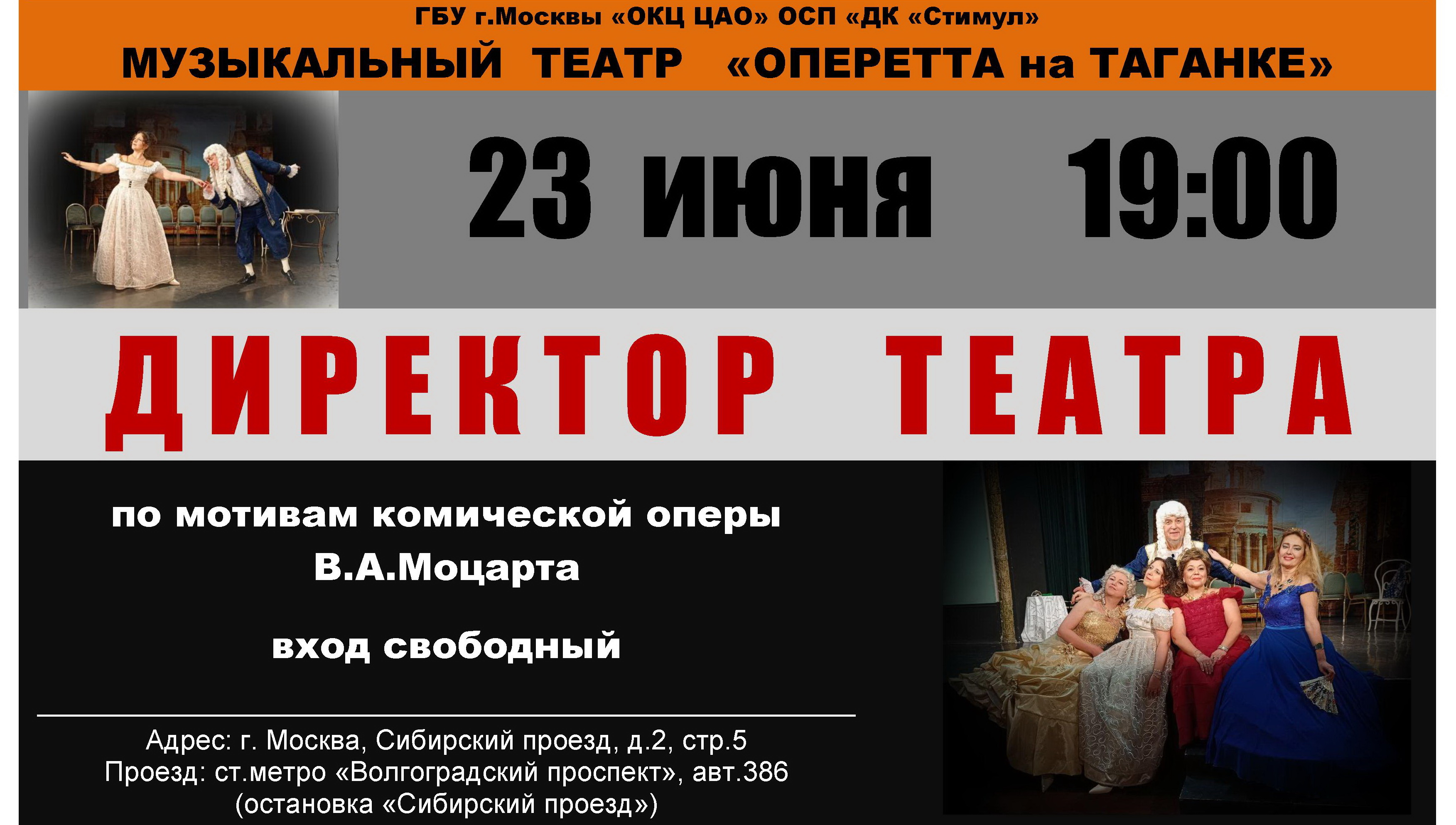 Музыкальный театр «Оперетта на Таганке» представляет музыкально-драматический спектакль «Директор театра» (версия театра на музыку В.А.Моцарта).